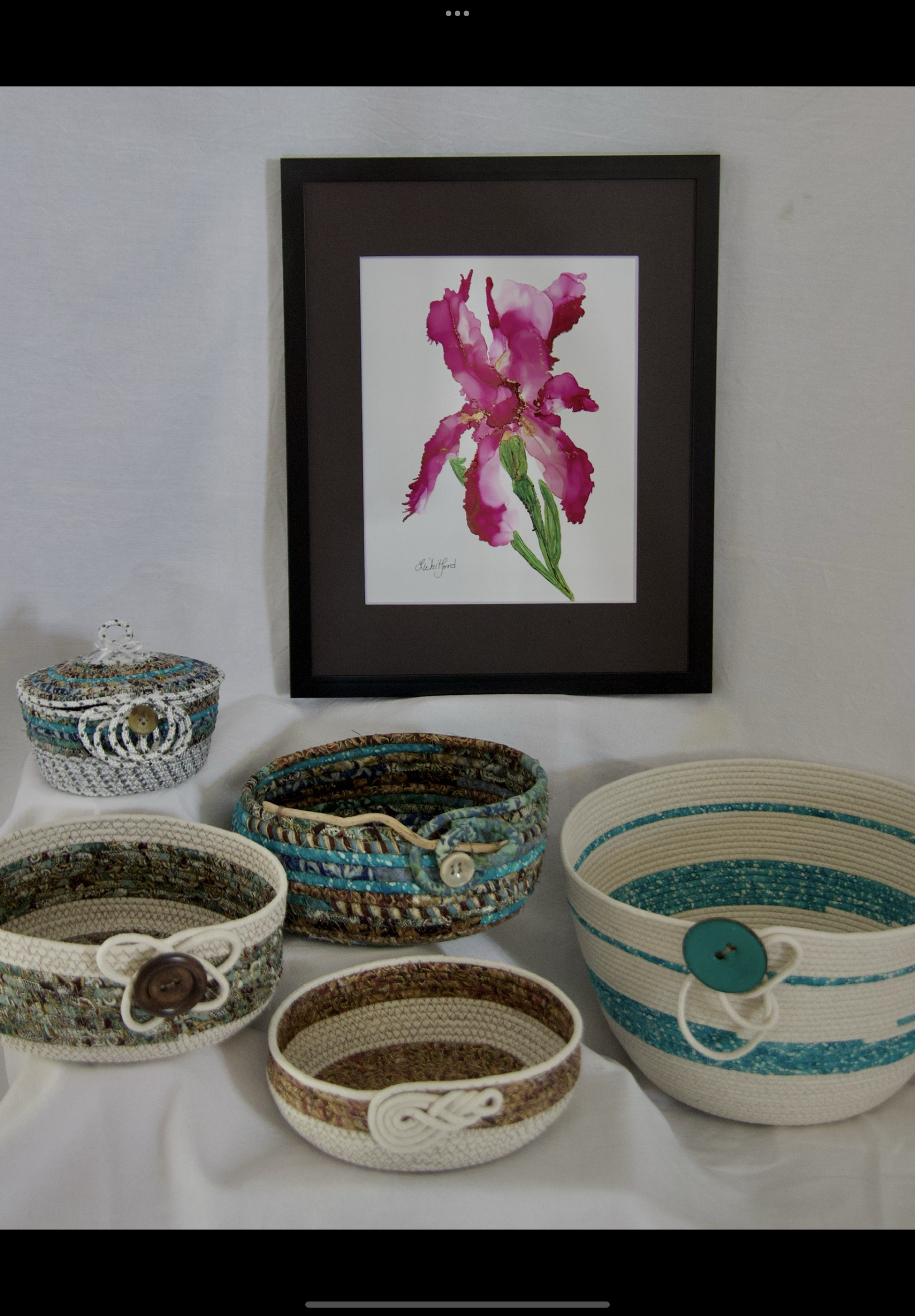 I like to work with a variety of mediums from watercolours to Alcohol Ink on paper, glass and mirrors. I am an avid quilter and also use fabrics and textiles with rope in creating rope bowls and baskets!